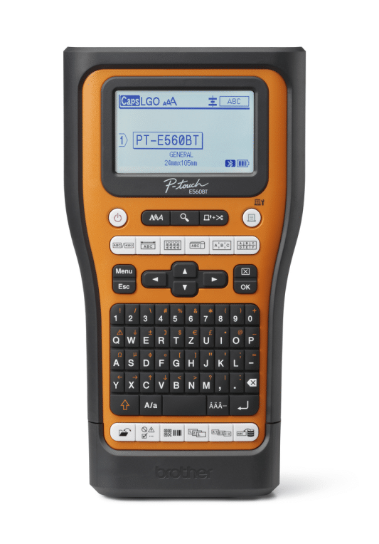 Brother PT-E560BTVP. Tecnología de impresión: Transferencia térmica, Resolución máxima: 180 x 180 DPI, Velocidad de impresión: 20 mm/s. Tecnología de conectividad: Inalámbrico y alámbrico, Bluetooth, Versión de Bluetooth: 5.0, Puerto USB. Diseño de teclado: QWERTY. Tipo de cinta: HSE/TZe. Color del producto: Negro, Naranja
