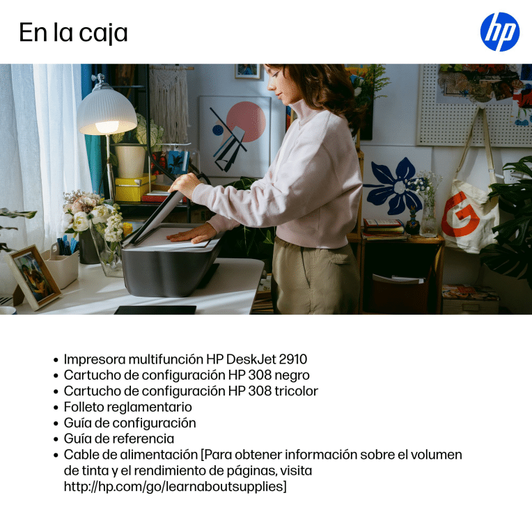 HP DeskJet 2910 Inalámbrico All-in-One Color Impresora. Tecnología de impresión: Inyección de tinta térmica, Impresión: Impresión a color, Resolución máxima: 4800 x 1200 DPI, Velocidad de impresión (color, calidad normal, A4/US Carta): 5,5 ppm. Copiando: Copia a color, Resolución máxima de copia: 300 x 300 DPI. Escaneando: Escaneo a color, Resolución óptica de escáner: 1200 x 1200 DPI. Funciones dúplex: Imprimir. Tamaño máximo de papel ISO A-series: A4. Wifi. Color del producto: Gris