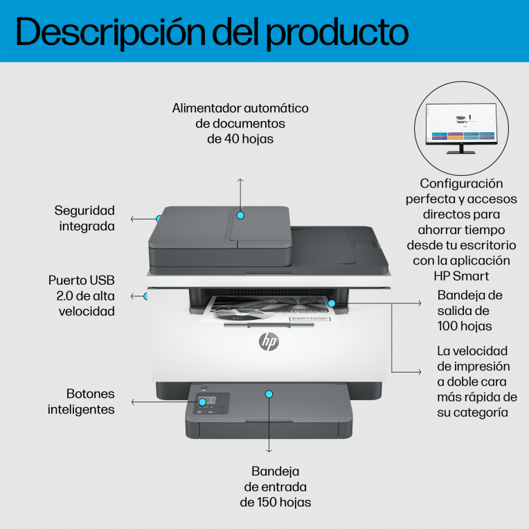 Superproductiva. Supercompacta. Una impresora multifunción de gran productividad con la impresión a doble cara más rápida de su categoría,[2] un alimentador automático y la aplicación HP que permite ahorrar tiempo.[6][7] Disfruta de una experiencia sin preocupaciones gracias a una configuración simplificada.. Cartucho HP JetIntelligence