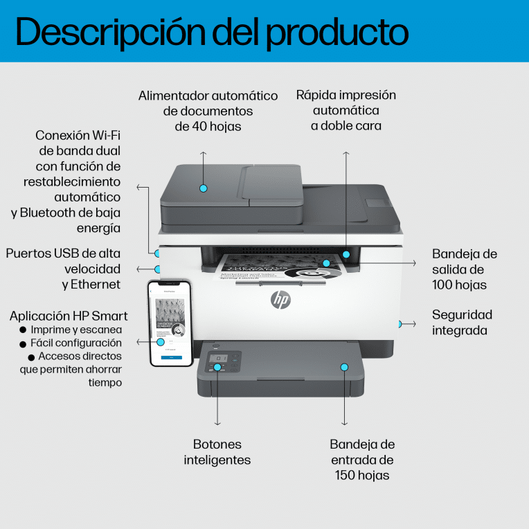 Superproductiva. Extremadamente compacta: con Wi-Fi fiable. Una impresora multifunción de gran productividad con la impresión a doble cara más rápida de su categoría,[2] un alimentador automático y la aplicación HP que te permite ahorrar tiempo.[6,7] Disfruta de la tranquilidad que supone tener conexiones más fiables[1] y una experiencia sin preocupaciones gracias a una configuración simplificada.. Cartucho HP JetIntelligence