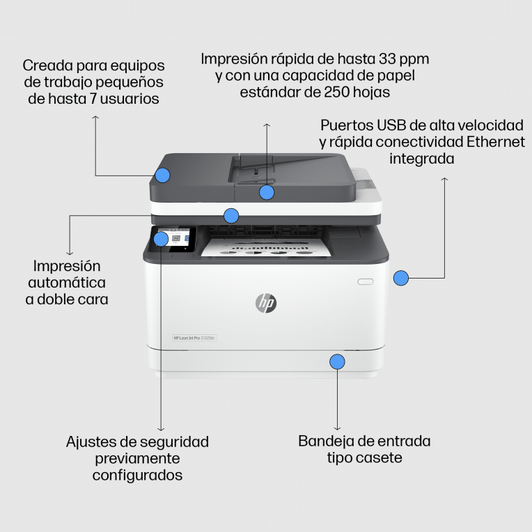 HP LaserJet Pro 3102fdn Multifunction Blanco y negro Impresora, Solo Ethernet; Fotocopiadora, escáner. Tecnología de impresión: Laser, Impresión: Impresión en blanco y negro, Resolución máxima: 1200 x 1200 DPI. Copiando: Copias en blanco y negro, Resolución máxima de copia: 300 x 300 DPI. Escaneando: Escaneo a color, Resolución óptica de escáner: 1200 x 1200 DPI. Enviando por fax: Envío y recepción de faxes en blanco y negro. Funciones dúplex: Imprimir. Tamaño máximo de papel ISO A-series: A4. Impresión directa. Color del producto: Blanco