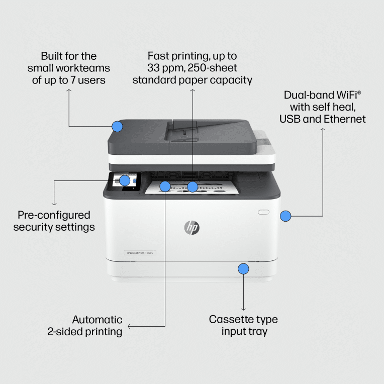 HP LaserJet Pro 3102fdw Inalámbrico Multifunction Blanco y negro Impresora, Fotocopiadora, escáner; Dúplex. Tecnología de impresión: Laser, Impresión: Impresión en blanco y negro, Resolución máxima: 1200 x 1200 DPI. Copiando: Copias en blanco y negro, Resolución máxima de copia: 300 x 300 DPI. Escaneando: Escaneo a color, Resolución óptica de escáner: 1200 x 1200 DPI. Enviando por fax: Envío y recepción de faxes en blanco y negro. Funciones dúplex: Imprimir. Tamaño máximo de papel ISO A-series: A4. Wifi. Impresión directa. Color del producto: Blanco