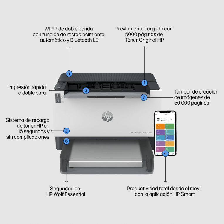 Potente productividad. Recarga sumamente asequible. Descubre las capacidades empresariales y el ahorro de la impresora HP LaserJet Tank 1504w previamente cargada con hasta 5000 páginas de Tóner Original HP[1]. Tecnología HP LaserJet Tank