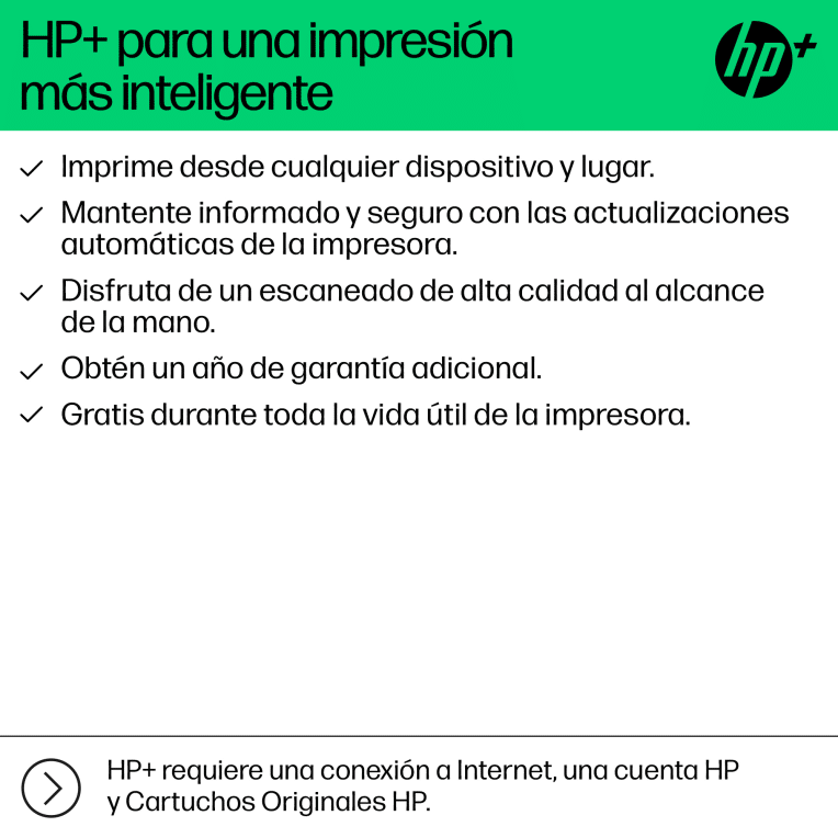 Esta es una impresora habilitada para HP+. Elige HP+ en la configuración del producto para activar las ventajas. HP+ requiere una cuenta HP, una conexión permanente a Internet y el uso exclusivo de cartuchos de Tinta Originales HP durante la vida útil de la impresora. Más información: http://www.hp.com/plus