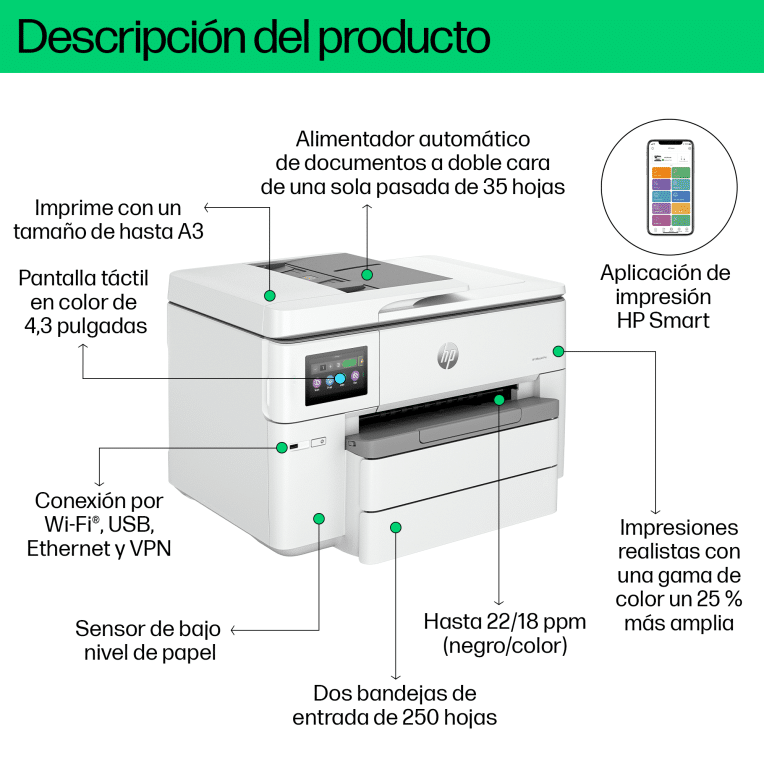 Imprime y escanea en formato ancho como un profesional. Dale la bienvenida a la impresora profesional de inyección de tinta a color de formato ancho para el crecimiento de tu negocio de la empresa de impresoras n.º 1 del mundo, en combinación con la aplicación de impresión más fácil de usar. Imprime y escanea en tamaños de hasta A3 con funciones de rendimiento adicionales.[1,2]. Apto para HP Instant Ink