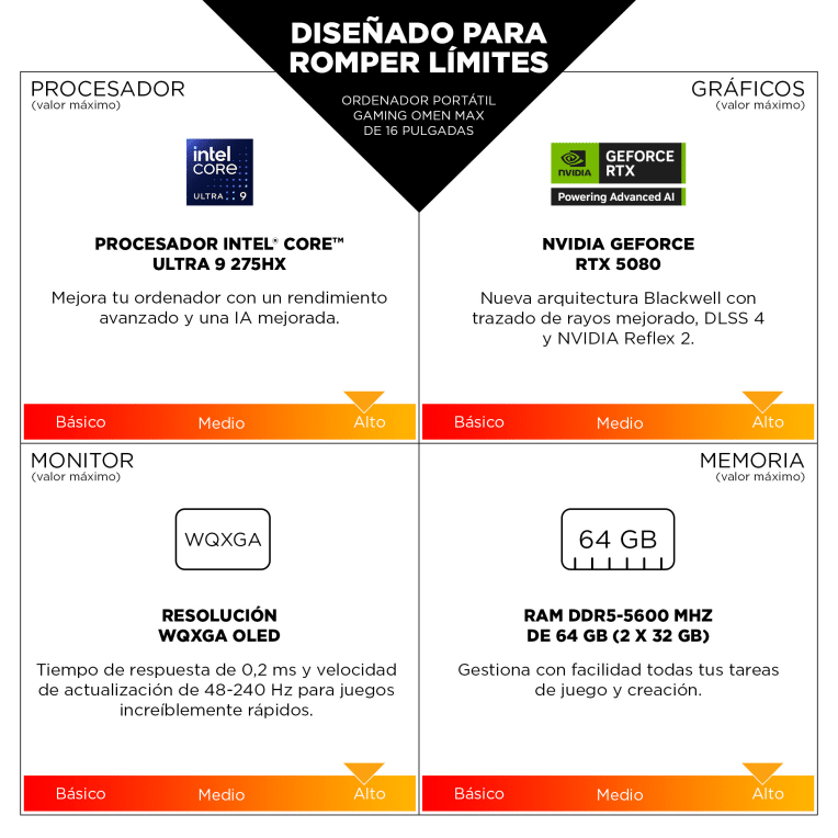 HP OMEN MAX Gaming Laptop 16-ah0039ns. Tipo de producto: Portátil, Factor de forma: Concha. Familia de procesador: Intel Core Ultra 9, Modelo del procesador: 275HX. Diagonal de la pantalla: 40,6 cm (16″), Tipo HD: WQXGA, Resolución de la pantalla: 2560 x 1600 Pixeles. Memoria interna: 32 GB, Tipo de memoria interna: DDR5-SDRAM. Modelo de adaptador de gráficos discretos: NVIDIA GeForce RTX 5070 Ti. Sistema operativo instalado: FreeDOS. Color del producto: Negro. Peso: 2,76 kg