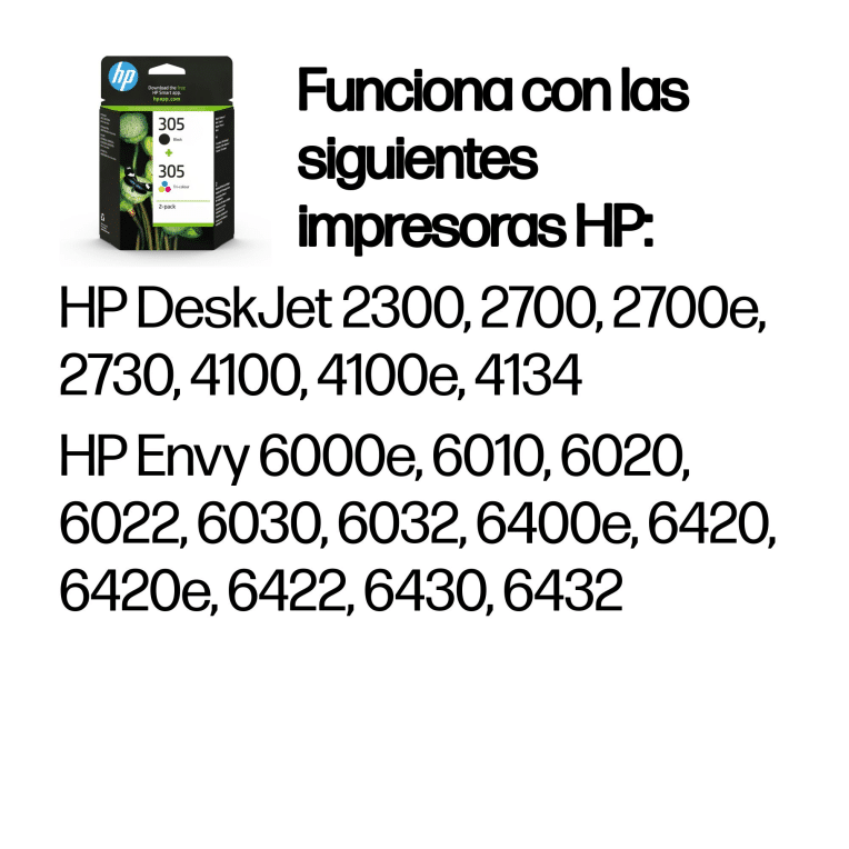 HP Paquete de 2 cartuchos de tinta original 305 tricolor / negro. Tipo de tinta de color: Tinta a base de colorante, Tipo de cartucho de tinta: Rendimiento estándar, Tipo de tinta negra: Tinta a base de pigmentos, Tipo de suministro: Pack de 2, Rendimiento de impresión de página con tinta de color: 100 páginas, Colores de impresión: Negro, Cian, Magenta, Amarillo, Cantidad por paquete: 2 pieza(s), Rendimiento de impresión de página con tinta negra: 120 páginas