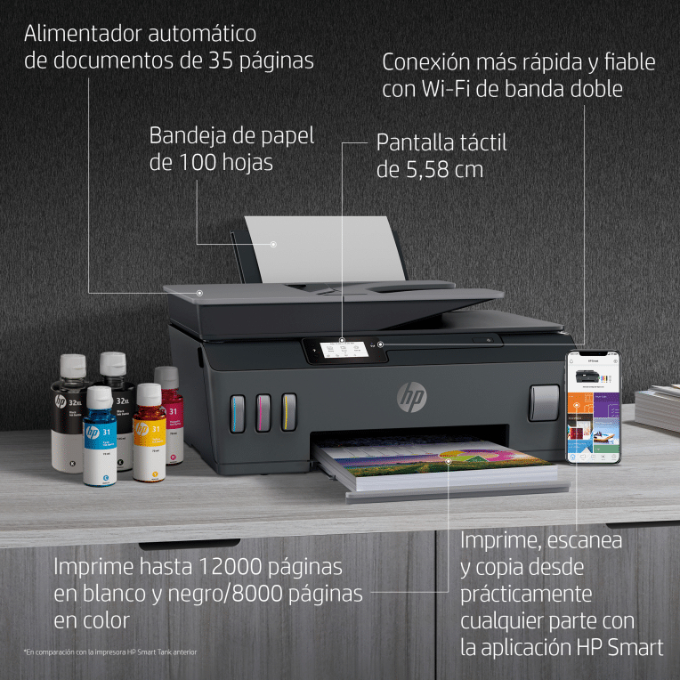 Esta impresora sin cartuchos y con un alimentador automático de documentos ofrece una calidad absoluta e incluye hasta 3 años de tinta.[1] Obtén conexiones más rápidas gracias al Wi-Fi de banda doble[3] y a una impresión móvil sencilla con la aplicación HP Smart.[4]