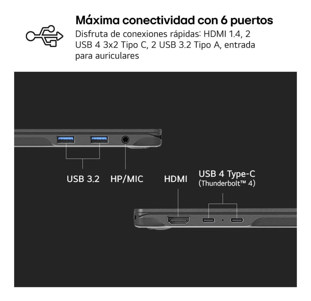 LG gram ofrece no solo varios puertos sino también 2 Thunderbolt™ 4 para la máxima escalabilidad.