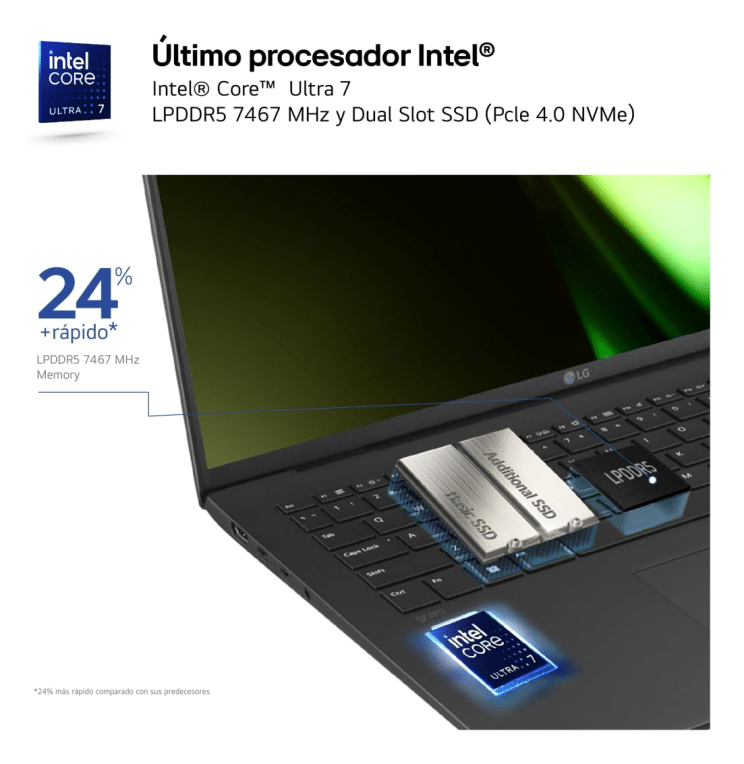 Experimenta una potencia adaptada a tus exigencias. Con el procesador Intel® Core™ Ultra 7, LG gram te permite obtener un rendimiento a la altura de tu demanda.